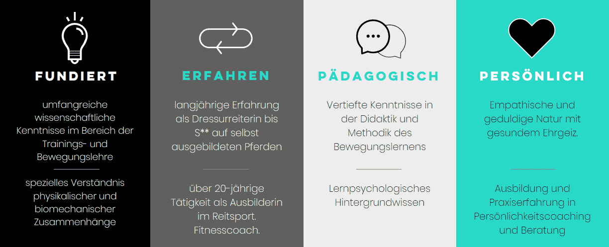 In der Zusammenarbeit mit mir werden Sie davon profitieren, dass ich sowohl reiterlich erfahren und erfolgreich bis Dressur Klasse S ** bin, als auch durch mein Sportpädagogik-Studium (Schwerpunkt "Trainingslehre") über den entsprechend fundierten theoretischen Hintergrund verfüge – sowohl fachlich als auch didaktisch. In meiner langjährigen Tätigkeit als Sportlehrerin in einer Hamburger Schule und auch als Reitausbilderin durfte ich zudem viele wertvolle Erkenntnisse dazu sammeln, wie ich meine Schüler bestmöglich fördern kann.